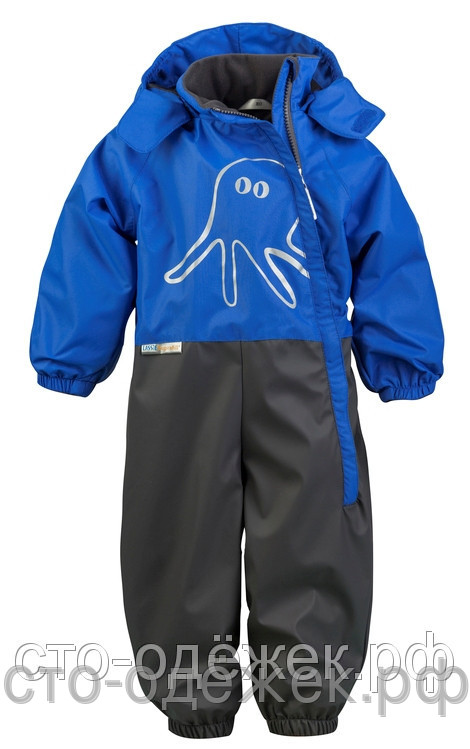 Нижняя часть изделия из водонепроницаемого, износостойкого материала Suprafill(R) с заваренными для дополнительной защиты от воды швами. Верхняя часть изделия из водонепроницаемого материала, швы проклеены. Застегивается комбинезон на длинную молнию, закрытую тонкой планкой. Мягкая подкладка на спинке до талии, в капюшоне, на воротнике, внутренней планке (под молнией) и манжетах. Внутренняя планка на вороте образует "карман" для замка молнии - защищает подбородок от прищемления замком молнии при застегивании комбинезона. Съемный капюшон присобран по бокам для наилучшей защиты ушек от ветра. Светоотражающие детали: принт "осьминог" на груди,на замке молнии, сзади и квадратные нашивки на рукавах. Съемные регулируемые эластичные штрипки. Сзади по талии кулиска с широкой резинкой (что создает слегка приталенный силуэт).